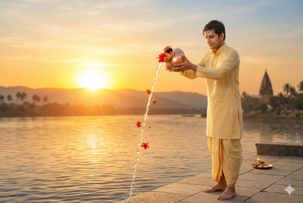 Sun Worship: Lord Surya (the Sun God) is worshipped on Mesha Sankranti. After your bath, you can offer clean water from a copper pot to the rising sun. Add a few red flowers and a small piece of jaggery to the water before offering it. - Chant Mantras: Sit in your puja space and listen to chant the Gayatri Mantra or the Surya Mantra and chant along. You can also offer simple prayers to Lord Shiva, Lord Vishnu, or Lord Hanuman.