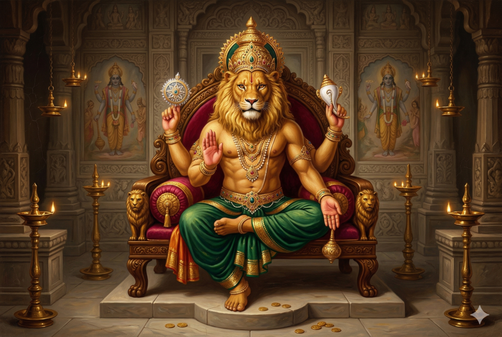 It marks the day Lord Vishnu took the Narasimha avatar to protect Prahlada and destroy evil. It represents protection and courage.